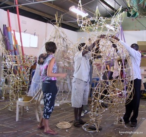 1 STILTS. Initiating training, stilt designs and construction, costumes for a community stilt troupe. Backpack based stilt characters